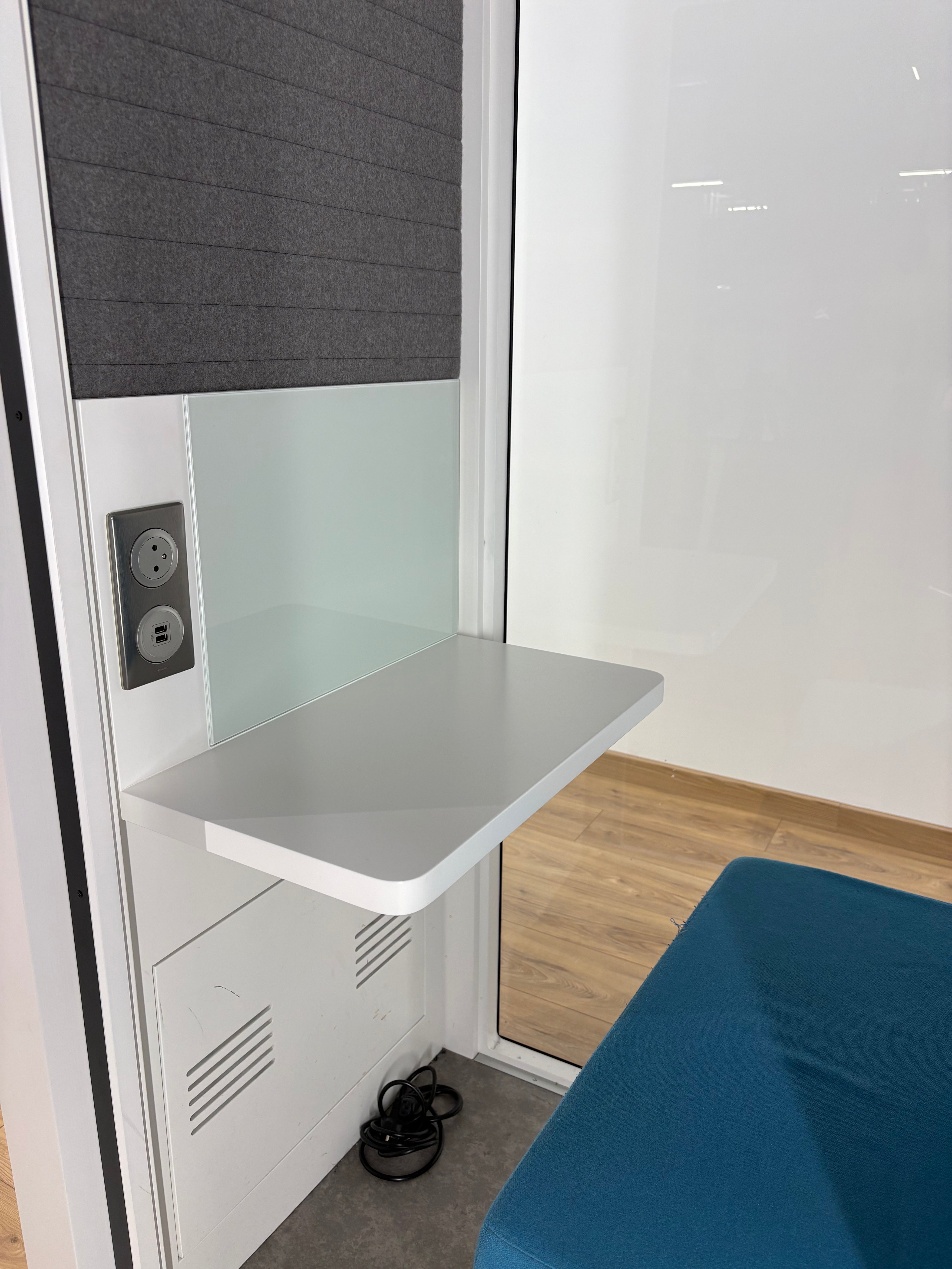 1 table de travail – 1 assise – Détecteur de présence couplé au système de ventilation et d’éclairage. – 1 Prise PC+ 1 prise USB A & C – Variateur lumière et ventilation – Témoin lumineux d’occupation – Quatre de roues intégrées - 306kg
